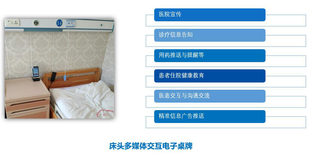 拓展床旁醫(yī)護、營養(yǎng)點餐、患者貼心服務、醫(yī)患交流、住院宣教、健康指導等功能,改善住院服務流程,改善患者就醫(yī)體驗,優(yōu)化醫(yī)患交互,改善醫(yī)療服務模式,提升智慧醫(yī)療的效率和水平。