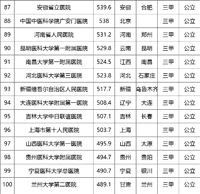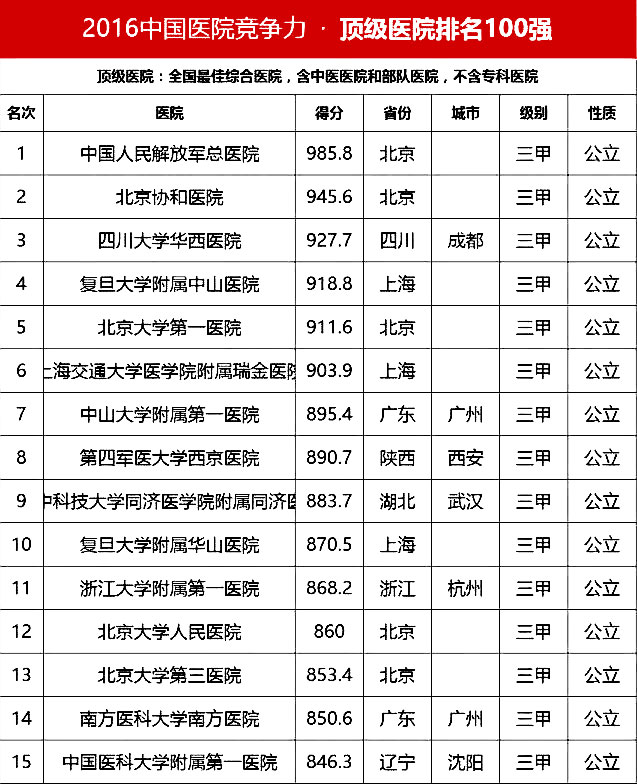 “頂級醫(yī)院100強”采用的排名指標體系包括四個方面:醫(yī)院最優(yōu)規(guī)模(實開床位數(shù)、年門急診量、年出院量、全院人數(shù));醫(yī)療技術(正高職稱人數(shù)/全院人數(shù)、全院醫(yī)師人數(shù)/實開床位數(shù)、醫(yī)療設備資產(chǎn)/總資產(chǎn)、年住院手術量/年出院量、國家級衛(wèi)紀委臨床重點???總??茣?、ICU床占比);醫(yī)院運行(平均住院天數(shù)、床位使用率、門診均次費用/當?shù)厝司鵊DP、住院均次費用/當?shù)厝司鵊DP、外省住院病人占比);學術影響力(院士人數(shù)、學術領袖占比、教育部重點學科及重點實驗室/總??茢?shù)、本年度獲國家自然科學基金項目數(shù)量和總全額)。