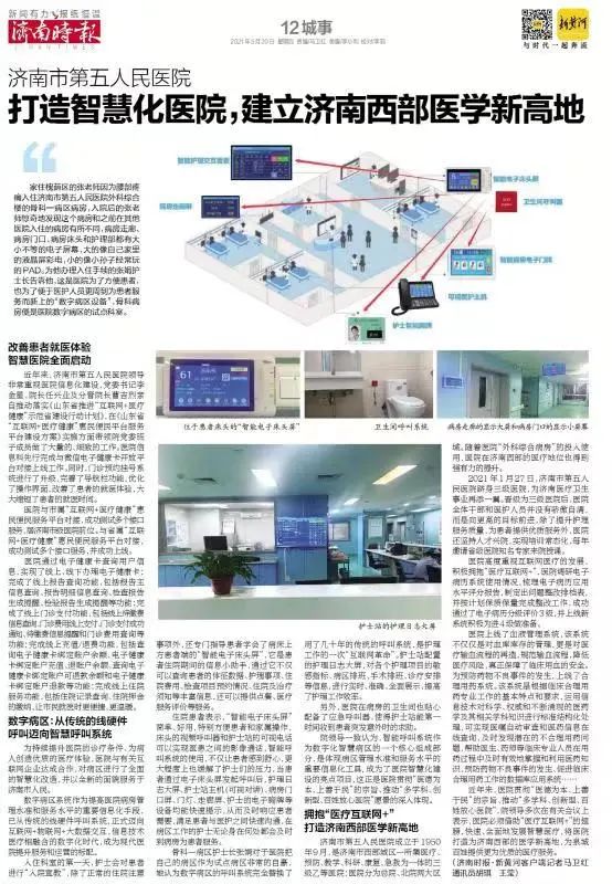 家住槐蔭區(qū)的張老師因?yàn)檠刻弁慈胱?jì)南市第五人民醫(yī)院外科綜合樓的骨科一病區(qū)病房,入院后的張老師驚奇地發(fā)現(xiàn)這個(gè)病房和之前在其他醫(yī)院入住的病房有所不同,病房走廊、病房門口、病房床頭和護(hù)理部都有大小不等的電子屏幕,大的像自己家里的液晶屏彩電,小的像小孫子經(jīng)常玩的PAD。為他辦理入住手續(xù)的張娟護(hù)士長告訴他,這是醫(yī)院為了方便患者,也為了便于醫(yī)護(hù)人員更周到為患者服務(wù)而新上的“數(shù)字病區(qū)設(shè)備”,骨科病房便是醫(yī)院數(shù)字病區(qū)的試點(diǎn)科室。